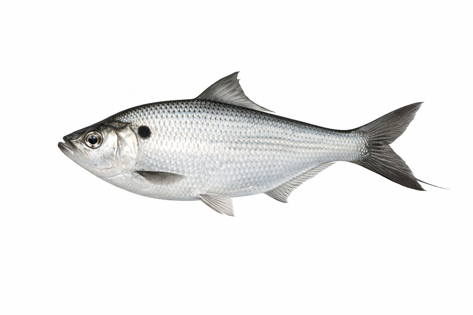 Deep, laterally compressed body with silver coloration. The body is noticeably deeper than most minnows, giving a herring-like appearance. Head is short with a small, toothless mouth oriented slightly upward.
