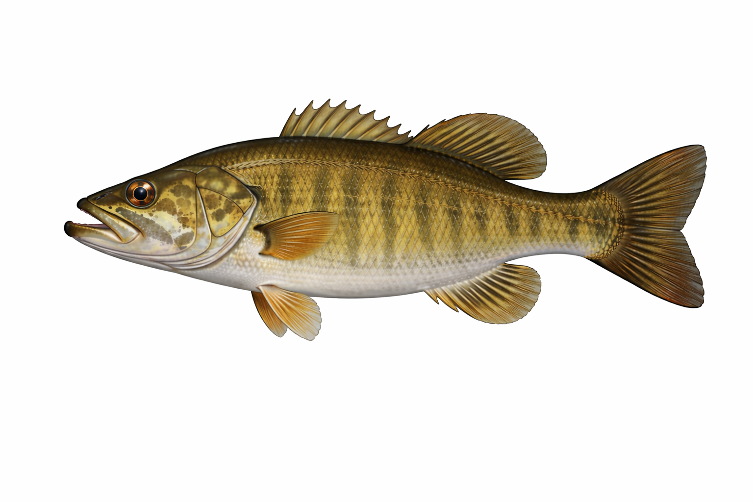 Smallmouth bass display a more streamlined, torpedo-shaped body compared to the deeper-bodied largemouth bass. Their bronze to brown coloration creates the nickname “bronzeback,” with darker backs transitioning to lighter bronze or golden sides and white bellies. The vertical barring pattern (8-15 bars) is more prominent than the horizontal stripe of largemouth bass, though bars may fade in larger specimens or vary with mood and habitat.